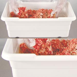 Food Handling Lug without Cover is a large, heavy duty polyethylene food lug, which lets you mix up to 50 lbs. of meat at a time. It removes the possibility of spillage, and helps mix the spices efficiently and more evenly while making sausage.