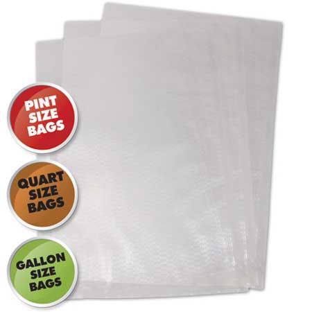 Commercial Grade Vacuum Bags 50 Bag Variety Pack is an universal vacuum bag which can be used to store food while preserving freshness, flavor and nutritional value. This heavy duty bag features air-removal channels for utmost freshness. Vacuum sealing facilitates food storage time locking while offering freshness, flavor and nutritional value. You can easily simmer or microwave food right in the bag, and you can also marinate foods in minutes. It is manufactured from FDA listed food safe materials. You will find it impressive for food and non-food uses such as preserving collectibles, valuable documents, silver or electronic items. Just make a small puncture in the Vacuum Bag before warming cooked foods or defrosting foods in the microwave. While simmering food in a Vacuum Bag you need to carefully check that the pot has sufficient water and the Vacuum Bag doesn't comes in direct contact with the bottom of the pot. You are required to follow food safety guidelines. You should not re-use Vacuum Bags after storing raw meats, greasy foods or fish and after microwaving or steaming, and also not in the oven or broiler. Commercial Grade Vacuum Bags 50 Bag Variety Pack Includes 25 8" x 12" bags, 15 11" x 16" bags, and 10 8" x 24" bags.