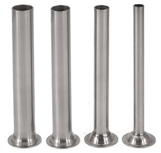 Set of 4 stainless steel stuffing tubes for 15, 20, 25 & 30 lb. sausage stuffers. Diameter of all tubes is 2" at the connecting point, and the outside diameters where casings are applied are as follows: