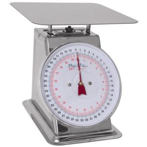Stainless steel body. 10 5/8" high with a 9 5/8" square stainless steel platform. Measures in 2 oz. and 50 g increments. 1 year warranty included.