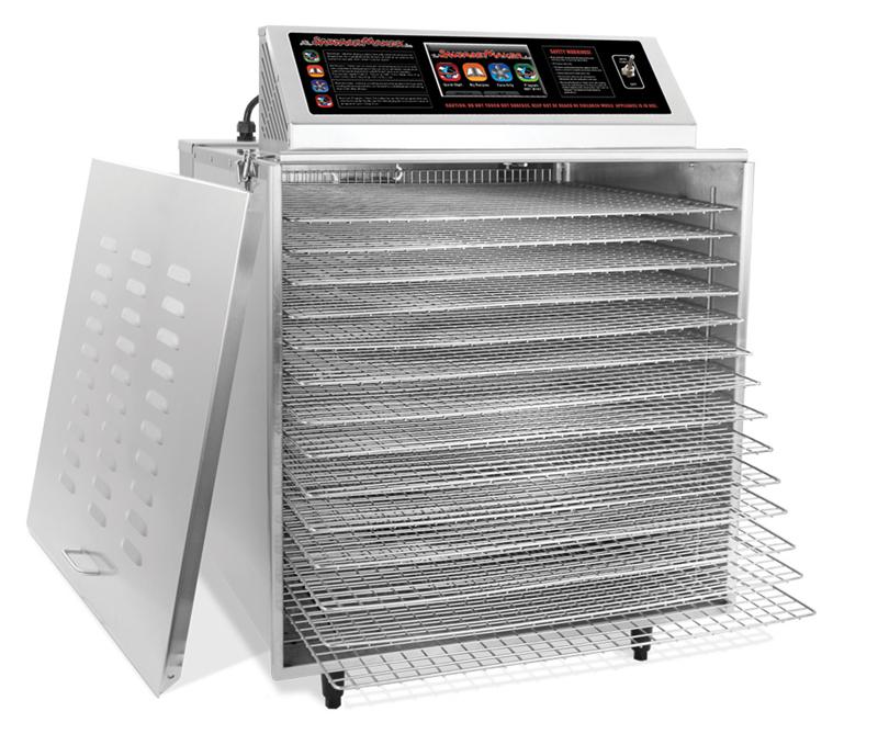 Constructed of stainless steel, this TSM sausage maker 14 shelf commercial food dehydrator protects your food from bacterial contamination and spoilage and is absolutely resistant to corrosion and rust. This commercial food dehydrator is a great option for cooking lovers as it is equipped with easy to read screen controls for easy understanding of the whole dehydration process. Plus, built in fan facilitates air ventilation to ensure accurate air circulation for the food. Its innovative construction and high-grade features assists in fast drying process for the most delightful jerky and other raw foods.