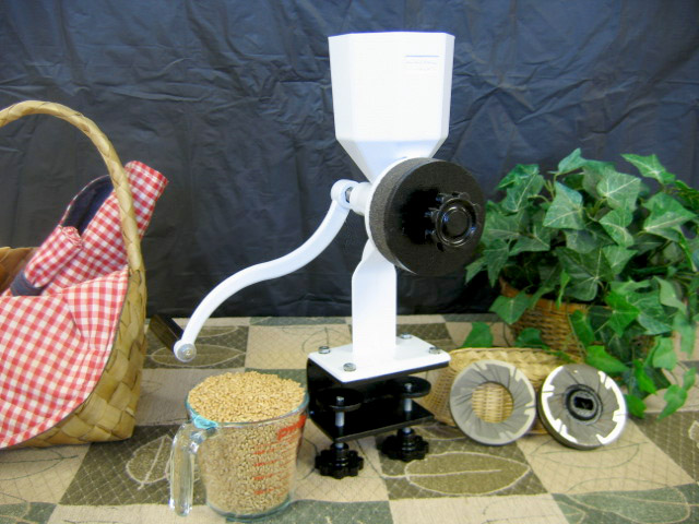 The grinder features a very strong and secure table clamp that keeps it stable on the platform. It is supplied with a flour guide and cleaning brush to keep grinding mess on the table to a minimum. The new flour guide guides flour into the container with any spill. It weighs only 10 pounds and is half the size of regular hand grain mills.